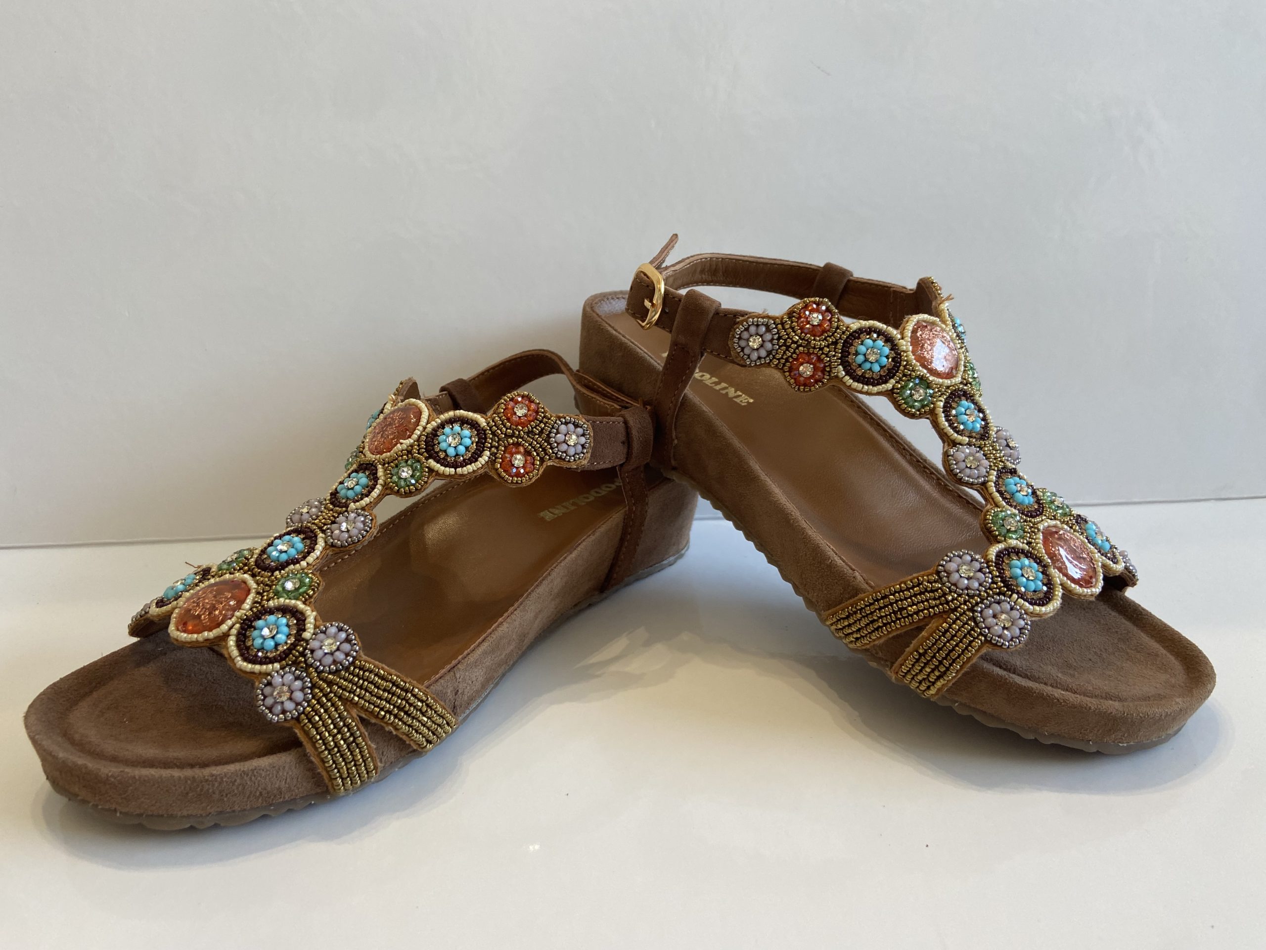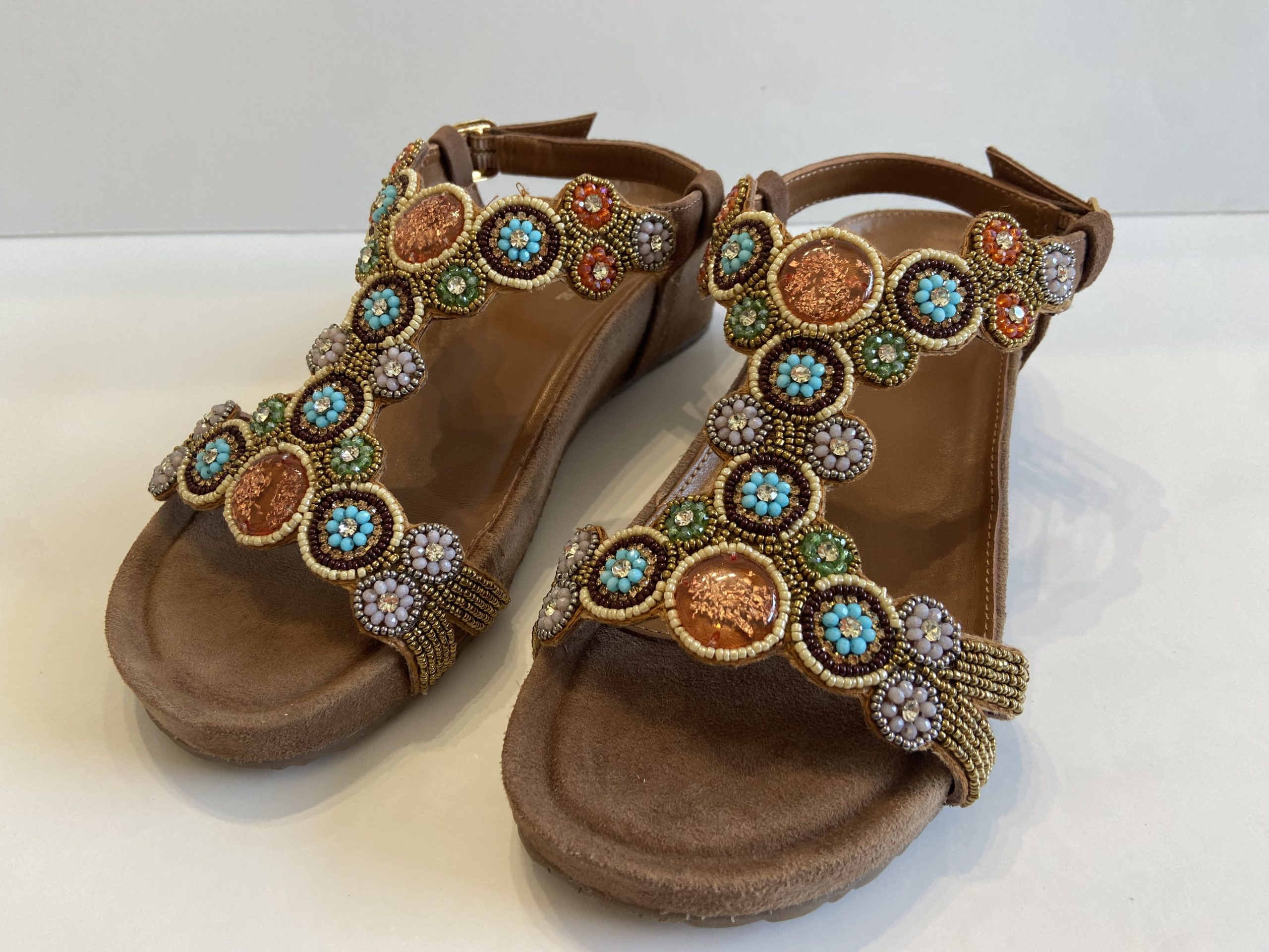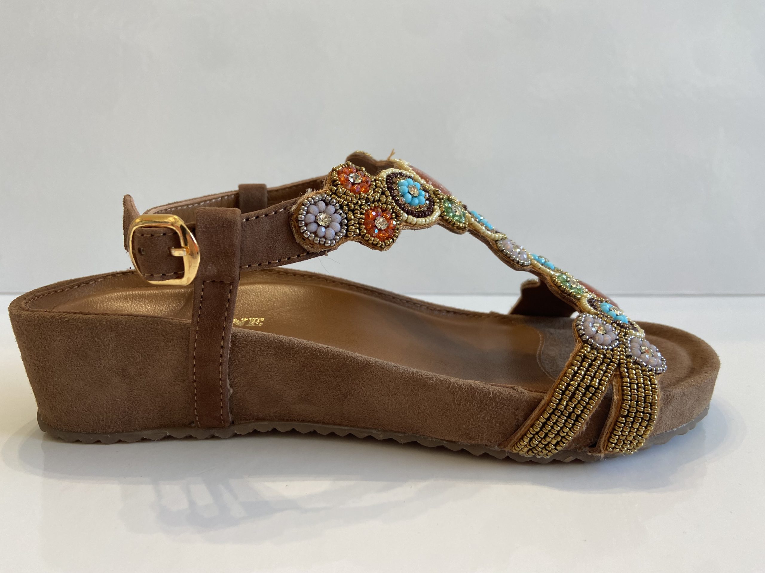 Sandalo donna con ricca applicazione sulla tomaia. Plantare morbido integrato nella zeppa il tutto rivestito di vera pelle. Chiusura con fibbia del laccio posteriore. Tomaia in camoscio color cuoio.